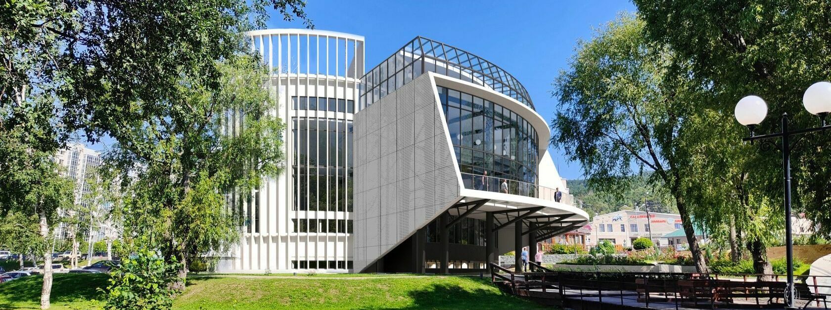 В основе проекта лежит принцип сохранения общей композиции объекта, состоящей из 2 разновысоких объемов. Расположение и общая геометрия здания, являет собой рубеж между городом и природой. В основе концепции предложено гармоничное решение встроить объект в парковую среду. Наибольшее внимание уделено ориентации здания в сторону горнолыжного комплекса «Горный Воздух», и горы «Большевик».